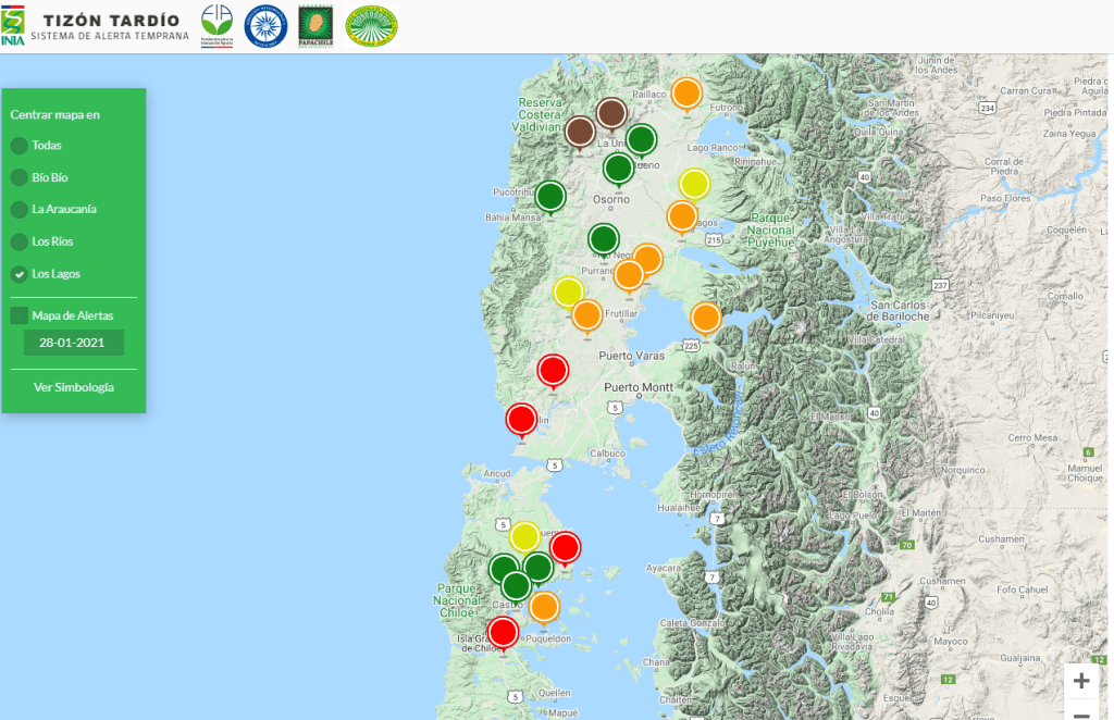 El sistema de alerta de tizón tardío (https://tizon.inia.cl/) es una herramienta de pronóstico que utiliza la información meteorológica, agregándole valor, con el fin de apoyar la toma de decisiones de productores de papa, profesionales y técnicos del agro, con el fin de manejar la enfermedad utilizando el control químico racionalmente, tanto en lo económico como en lo ambiental. Gracias a este sistema y la experiencia de varios años de uso, el productor planifica anticipadamente su estrategia de control, considerando el momento oportuno de la primera aplicación y la frecuencia de las aplicaciones posteriores, donde el conocimiento del comportamiento del cultivo, la eficiencia y modo de acción de los fungicidas y el comportamiento de la enfermedad bajo su condición de producción, permiten controlar en forma más eficiente esta enfermedad.