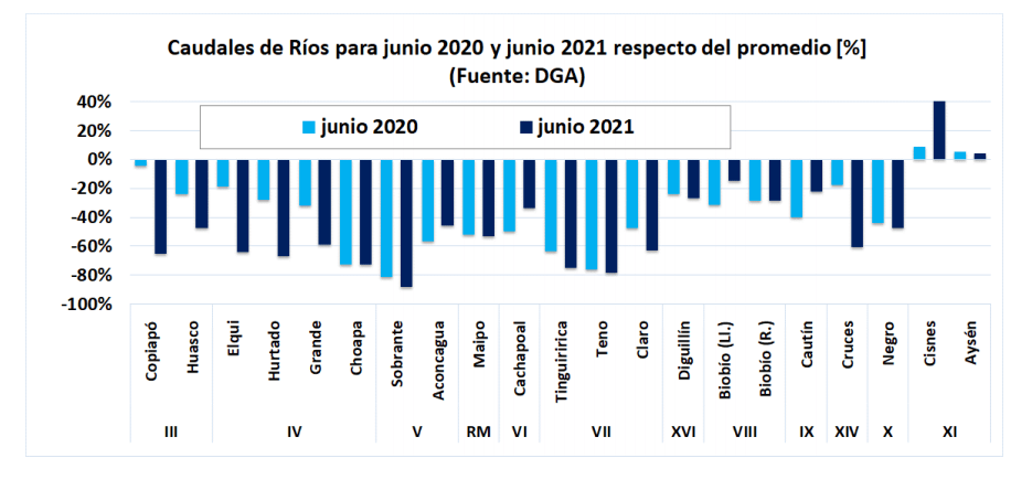 Respecto de los caudales, en el último boletín de junio de la DGA se aprecia que todos los ríos están bajo sus caudales promedio, salvo rio Cisnes y Aysén. Además, solo en la región de Valparaíso y desde la parte sur de la región del Maule hasta la de la Araucanía, los caudales actuales son claramente mayores a los del mes de junio del año 2020. En el resto del país, la situación es muy variable ya que mientras en algunos ríos los caudales eran mayores a los del año pasado, en otros sistemas fluviales eran menores o muy similares.