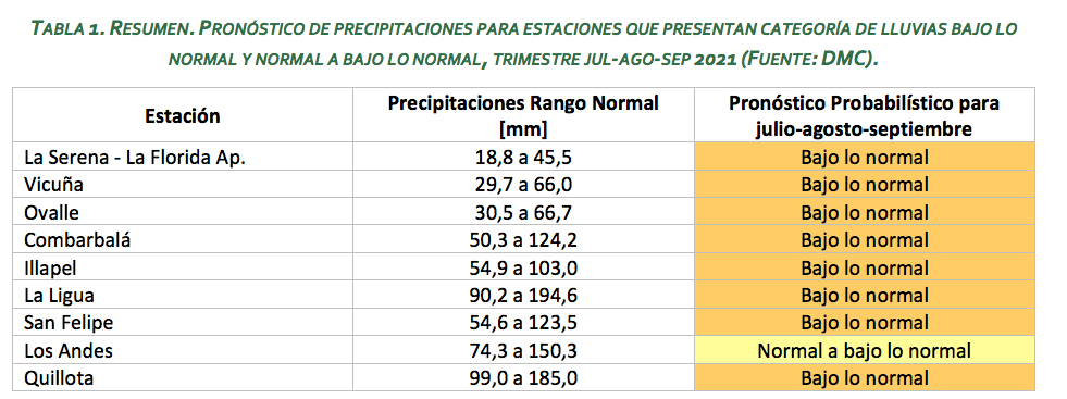 El pronóstico estacional vigente, elaborado por la Dirección Meteorológica de Chile para el trimestre julio-agosto-septiembre 2021 indica que las lluvias estarían en la categoría de normal a bajo lo normal a la cateogría bajo lo normal, en general, en la zona de la región de Coquimbo a Maule. La Tabla 1 nos ayuda a interpretar cuánto llovería en total, en algunas ciudades, entre julio y septiembre. Por ejemplo, es normal que en Vicuña llueva 40,3 a 109,6 [mm] en el trimestre jul-ago-sep (valor promedio de 30 años, 1991-2020) y dado que el pronóstico indica “sobre lo normal”, entonces, llovería más de 109,6 [mm] en ese trimestre.
