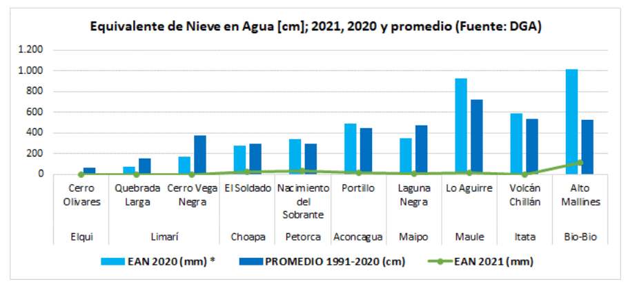 En este mismo reporte la DGA presenta la situación de la nieve. El equivalente de agua en nieve (EAN) presenta un déficit promedio de -94% en las Rutas de Nieve de la Red Hidrometeorológica de la Dirección General de Aguas. En la cuenca del Limarí las Rutas Quebrada Larga y Cerro Vega Negra presentan un -100%.