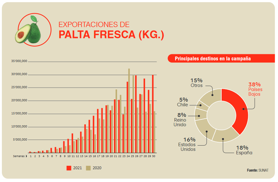 Desde principios del presente año hasta el cierre de julio, las exportaciones de palta peruana sumaron 407,349 toneladas brutas. Esto significó un crecimiento del 19% en comparación a los primeros siete meses del 2020. Asimismo, la Asociación de Productores de Palta Hass del Perú (ProHass) estima que los envíos de este fruto lleguen a superar las 473,000 toneladas para la campaña 2021, que culmina en la segunda quincena de septiembre.