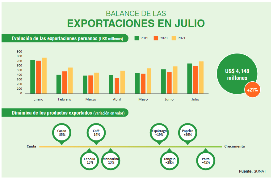 De acuerdo con las estimaciones de FreshFruit, las exportaciones peruanas de productos agrícolas en julio alcanzaron los US$ 702 millones. En comparación al mismo mes del 2020, cuando se flexibilizaron las restricciones y se impulsó la reactivación económica, los envíos del sector crecieron 17%. Con respecto al 2019, un año típico para la economía, las exportaciones mostraron un incremento de 7%. Con este resultado, durante los primeros siete meses del año se exportaron US$ 4,148 millones en productos agrícolas, 21% por encima del 2020 y 16% sobre el 2019.