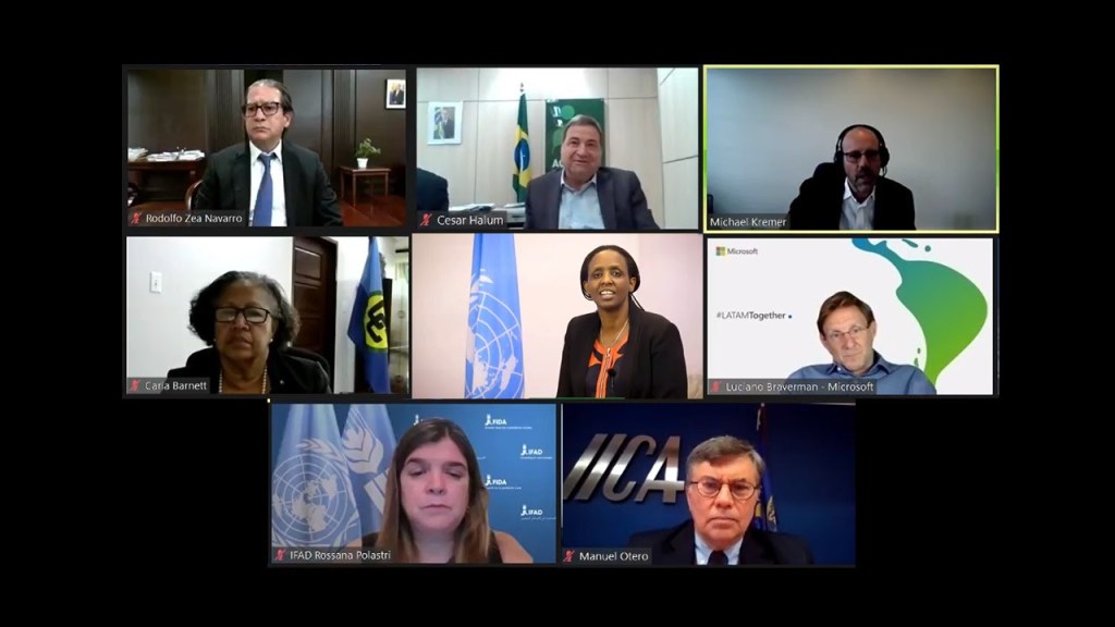 El Ministro de Agricultura y Desarrollo Rural de Colombia, Rodolfo Zea Navarro; el Secretario de Agricultura Familiar y Cooperativas del MAPA Brasil; César Halum; el Premio Nobel de Economía 2019 y Embajador de Buena Voluntad del IICA, Michael Kremer; la Secretaria General del CARICOM, Carla Barnett; La Enviada Especial del Secretario General de la ONU para la Cumbre de Sistemas Alimentarios 2021, Agnes Kalibata; el Director de Educación para Microsoft, Luciano Braverman; la Directora para América Latina y el Caribe del FIDA, Rossana Polastri; y el Director General del IICA, Manuel Otero, durante el evento.