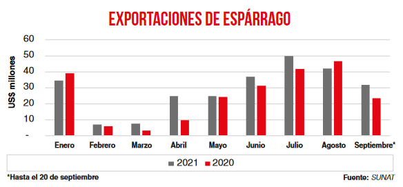 Hasta el 20 de septiembre del 2021, las exportaciones peruanas de espárrago sumaron 84,335 toneladas por US$ 260 millones. En comparación a similar periodo en el 2020, los envíos de la hortaliza crecieron 16% en volumen y 15% en valor. Durante estos meses, el precio promedio del espárrago peruano fue US$ 3.08 por kilogramo, similar al obtenido el año anterior (US$ 3.11 por kilogramo).