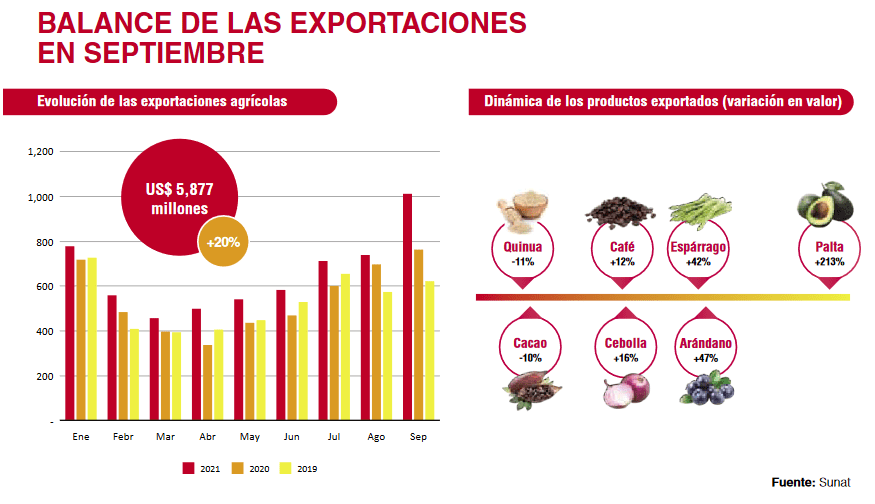 De acuerdo con las estimaciones de FreshFruit, las exportaciones peruanas de productos agrícolas en septiembre alcanzaron las US$ 1,026 millones. En comparación al mismo mes del 2020, los envíos del sector crecieron 32%. En lo que va del año, se exportó US$ 5,877 millones, 20% mayor al 2020 y 23% mayor al 2019.
