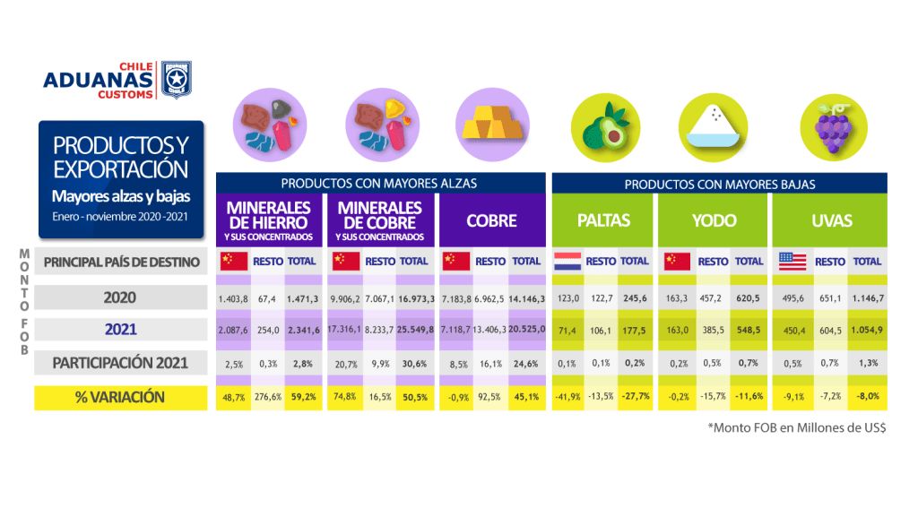 El Reporte de Comercio Exterior consigna que entre el 1° de enero y el 30 de noviembre del 2021 las importaciones nuevamente tuvieron un importante aumento al compararlo con el mismo período del 2020, con compras por US$ 78.588,8 millones equivalente a un alza del 56,5%. Las exportaciones también fueron positivas con un crecimiento del 31% al concretarse ventas de productos chilenos por US$ 83.469 millones.