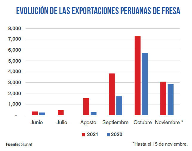 La campaña exportadora de fresa, que va de junio a febrero, llegó a su pico más alto en las últimas semanas. Hasta la quincena de noviembre, los envíos de la fruta sumaron 16,446 toneladas por US$ 34 millones. En comparación al año anterior, las exportaciones de fresa crecieron 19% en volumen y 29% en valor. A pesar del incremento de la oferta, el precio obtenido por la fruta peruana en el mercado internacional fue de US$ 2.06 por kilogramo, 8% más alto con respecto a similar periodo del 2020. Cabe señalar que el 99% de la fresa peruana se envía congelada.