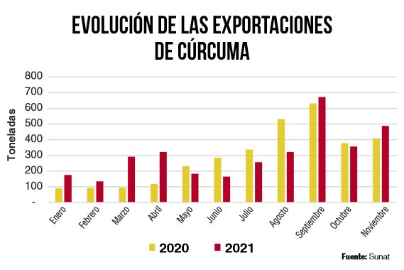 Entre enero y noviembre, las exportaciones peruanas de cúrcuma sumaron 3,367 toneladas por US$ 6 millones. En comparación con el año anterior, los envíos de la raíz crecieron 5% en volumen y 7% en valor. A pesar del incremento de la oferta, el precio de la cúrcuma creció 2%, hasta cotizarse en US$ 1.77 por kilogramo.