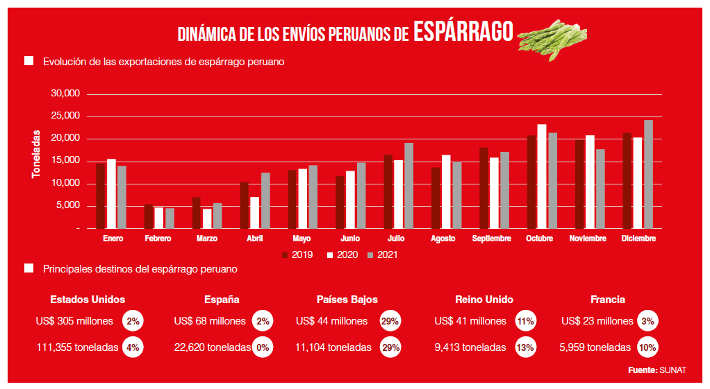 Durante el 2021, los principales destinos de las exportaciones peruanas de espárrago fueron Estados Unidos, España, los Países Bajos, el Reino Unido y Francia, que en conjunto tuvieron 89% de participación.