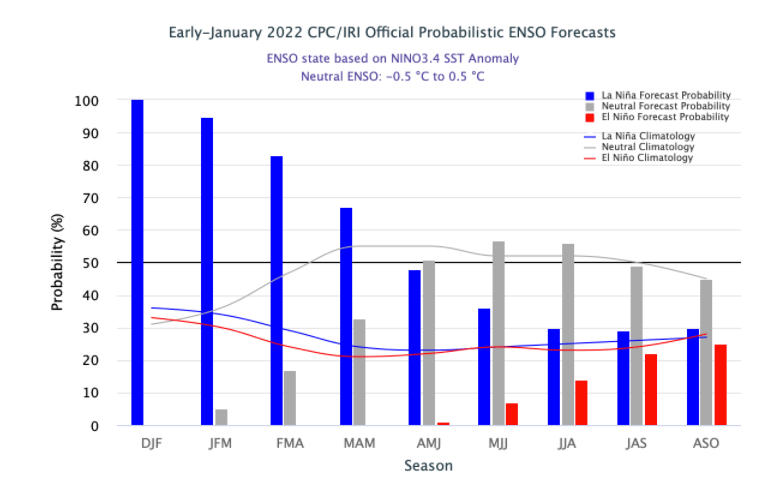 Situación: Advertencia de la Niña. Sinopsis: enero-febrero-marzo de 2022 con 80% de probabilidad para La Niña; inicia condición neutra el trimestre marzo-abril-mayo con 63% de probabilidad.