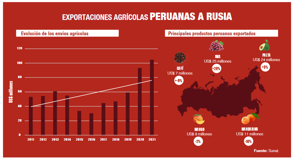 De acuerdo al análisis de Fresh Fruit Perú a partir del 2017, y hasta el 2021, los envíos desde el Perú hacia Rusia dieron un salto. El despegue se logró gracias a la mayor exposición que tuvieron los productos agrícolas peruanos durante el Mundial de Fútbol 2018, que tuvo como sede a este país.