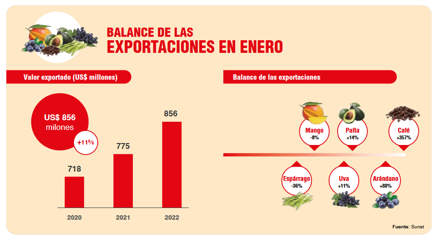 De acuerdo con las estimaciones de FreshFruit, las exportaciones peruanas de productos agrícolas en enero alcanzaron los US$ 856 millones, 11% más frente al mismo mes del 2021 y 19% mayor al 2020. El crecimiento alcanzado durante el primer mes del año se explicó por el buen desempeño de la uva, el arándano y la palta, así como por el incremento en el precio del café en el mercado internacional. Sin embargo, no todos los productos tuvieron un buen cometido; el espárrago y el mango han tenido dificultades en el mercado internacional, ocasionando una contracción de sus envíos.
