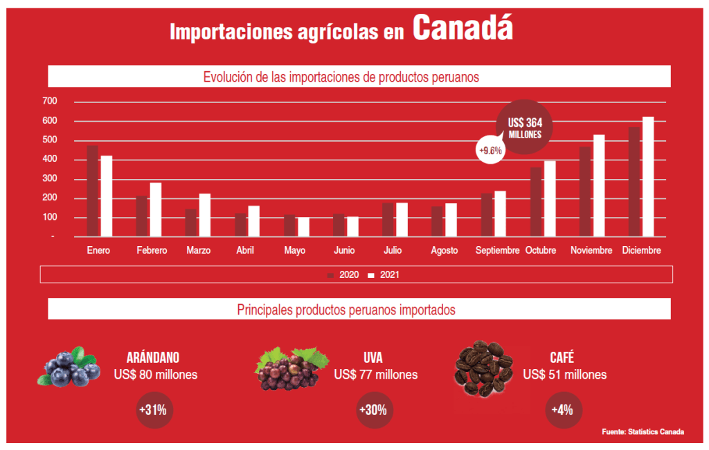 De acuerdo al análisis de Fresh Fruit Perú, los principales productos agrícolas peruanos importados por Canadá fueron el arándano, la uva y el café, que en conjunto tuvieron una participación de 57%. Una canasta poco diversificada, que limita el crecimiento del Perú en este destino.