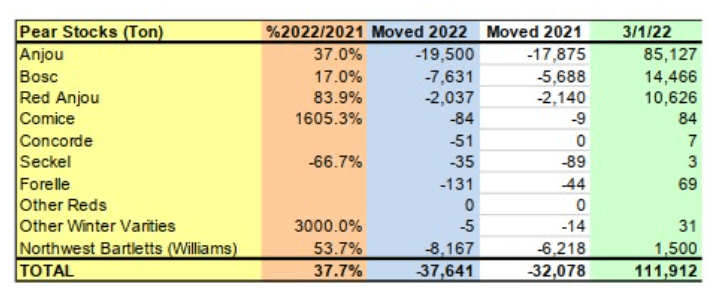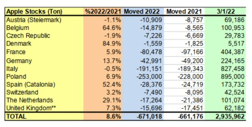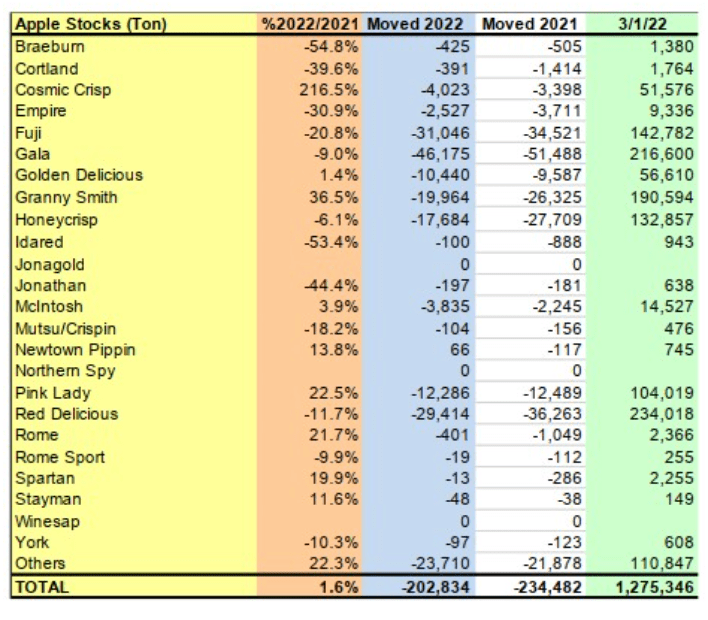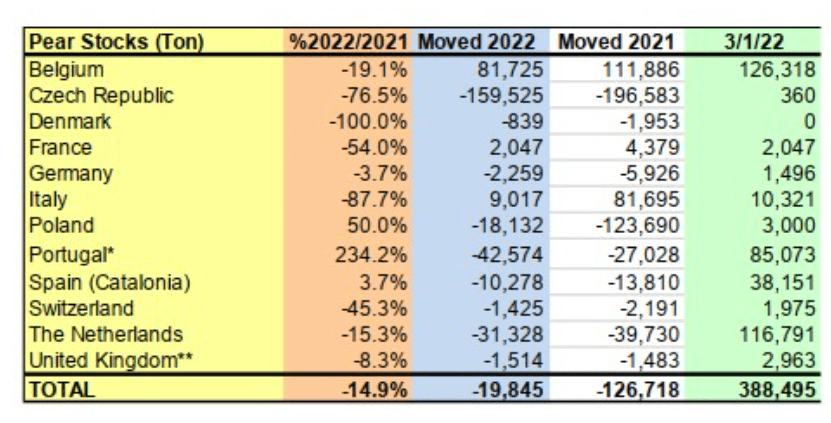 WAPA, la Asociación Mundial de Manzanas y Peras, dio a conocer el 01 de abril las cifras de las existencias de manzanas y peras a partir del 1 de marzo de 2022.