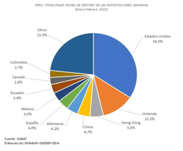 Los diez principales países de destino de las exportaciones agrarias peruanas fueron: Estados Unidos, Holanda, Hong Kong, China, Alemania, España, México, Ecuador, Canadá, Colombia. Este grupo de países concentraron el 77% del total del valor FOB exportado en el periodo de estudio