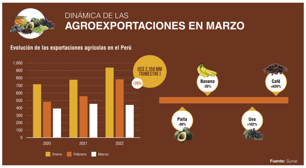 De acuerdo con las estimaciones de FreshFruit, las agroexportaciones peruanas en marzo alcanzaron los US$ 438 millones, 12% por encima de lo exportado en el mismo mes del 2021 y del 2020. El valor acumulado durante el primer trimestre alcanzó US$ 2,158 millones, 21% más que el mismo periodo del año anterior. Cabe mencionar que, en los dos meses anteriores, el incremento de las agroexportaciones había superado el 20%, por lo que marzo es el mes con la tasa de crecimiento más baja hasta la fecha.