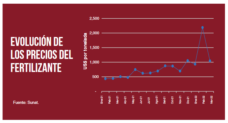 Para el caso específico del Perú, observamos que las importaciones de fertilizante en el primer trimestre del año sumaron 283,902 toneladas por US$ 400 millones, 20% menos en volumen y 141% más en valor con respecto al año anterior. El precio en este periodo fue de US$ 1,410 por tonelada, 201% más. Considerando que los fertilizantes son de suma importancia para un país agrícola como el Perú, que importa al año más de 1,800 toneladas por US$ 1,200 millones, esta dinámica viene teniendo un impacto sumamente significativo.