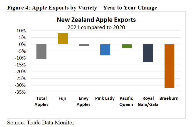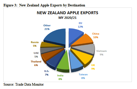 Las exportaciones para el periodo 2020/21 cayeron a 357.800 toneladas, un 11% menos que el año anterior, ya que la escasez de mano de obra para la cosecha, así como el granizo que dañó parte de la cosecha, redujeron la producción. Este fue el volumen de exportación más bajo desde 2016/17, y anteriormente había habido tres años consecutivos de aumento de las exportaciones de manzanas.