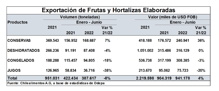 Chilealimentos ha elaborado un informe detallado con las exportaciones de frutas y hortalizas elaboradas al sexto mes del año. En esta ocasión, el valor acumulado supera los US$ 940 millones, mientras que los volúmenes exportados llegan a las 387 mil toneladas.