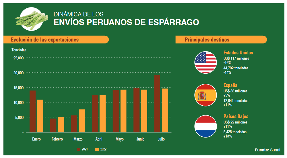 De enero a julio del 2022, las exportaciones de espárrago en todas sus presentaciones (fresco, congelado y procesado) sumaron 78,957 toneladas por US$ 239 millones. Una reducción de 7% en volumen y 9% en valor con respecto al mismo periodo del 2021.