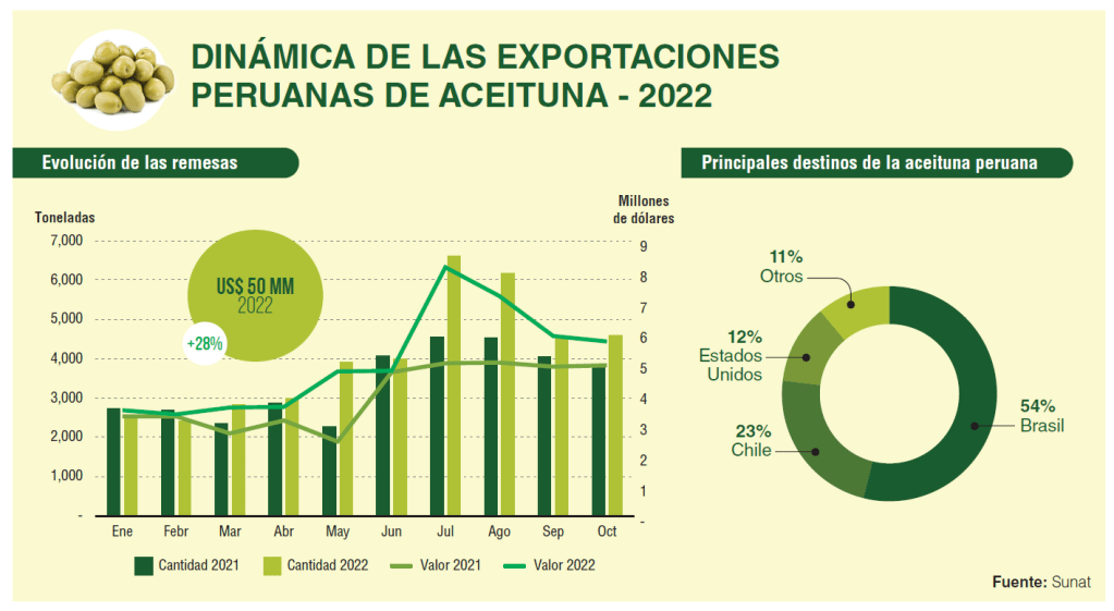 Y el futuro inmediato parece promisorio para el fruto del olivo, pues el resultado final del 2022 también resultará positivo. Hasta octubre, las exportaciones de aceituna sumaron 40,660 toneladas por un valor de US$ 50 millones. Esto representó un crecimiento del 20% en volumen y 28% en valor. Por tanto, se podría esperar que, a falta de dos meses para finalizar el año, la tendencia de crecimiento se mantenga.
