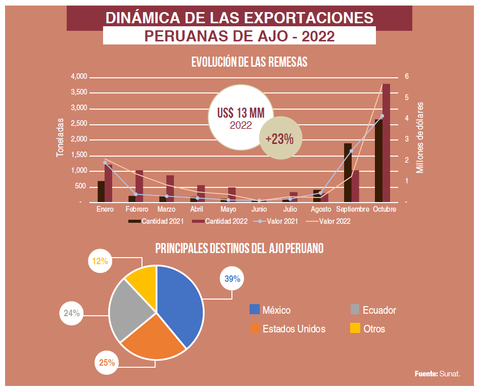Hasta octubre del 2022, los principales destinos del ajo peruano fueron México (39% de participación), los Estados Unidos (25%) y Ecuador (24%).