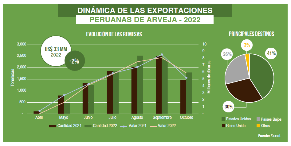 La arveja peruana tiene una ventana comercial que va desde abril hasta diciembre. Sin embargo, hasta octubre se concentra el 96% de los envíos. En este periodo del 2022, las exportaciones de arveja sumaron 10,274 toneladas por un valor de US$ 33 millones hasta octubre. Dicho resultado representa un crecimiento de apenas 1% en volumen y un pequeño retroceso del 2% en el valor. Estos resultados se dan después de una ligera caída en el precio recibido por la arveja peruana, cotizada en promedio en US$ 3.23 el kilogramo (3% menos que el año anterior).