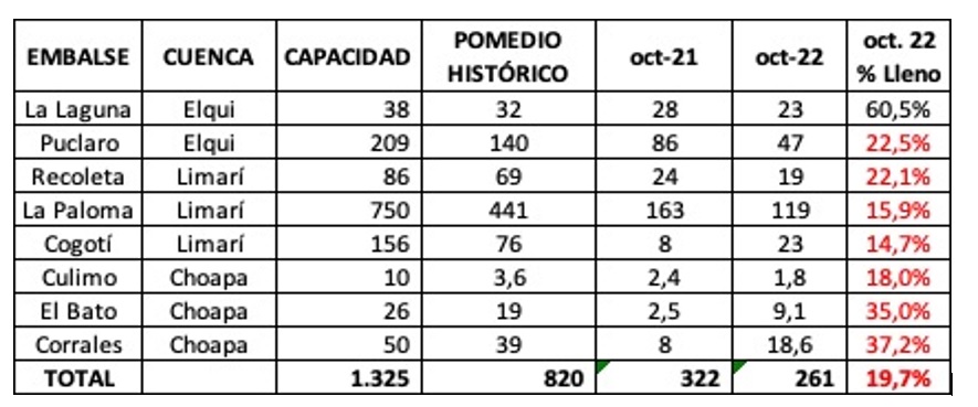 Este año la Región de Coquimbo hasta el mes de octubre registraba 261 millones de metros cúbicos disponibles del recurso hídrico, mientras que el año 2021 a la misma fecha contaba con 322 millones de metros cúbicos, lo que significa que la disponibilidad de agua disminuyó pese a las lluvias y nieve caída este año 2022.