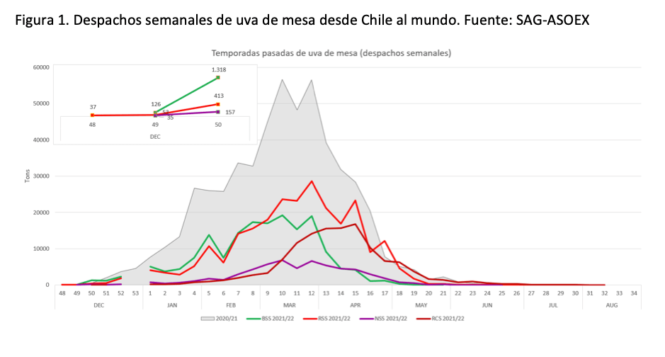 Hasta la semana 48, finalizada el 4 de diciembre, no se han registrado despachos de este frutal, a diferencia de la temporada pasada en que ya se habían exportado 37 toneladas, correspondientes a 4.560 cajas de 8,2 Kg eq. Durante el ejercicio pasado los envíos de la semana 48 fueron exclusivamente de variedades rojas sin semillas, sin embargo, a la semana 49 las variedades blancas sin semillas tomaron el protagonismo en los despachos.