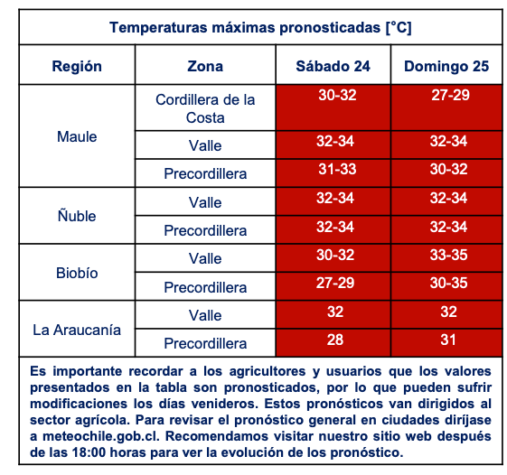 También es importante tener en consideración las temperaturas mínimas del domingo 25, con valores entre 19 y 21°C en valles y precordillera de la Región de Ñuble, y en valles de la Región del Biobío, y entre 18-20°C en precordillera de la Región del Biobío. Los valores de temperatura máxima estimada se detallan a continuación: