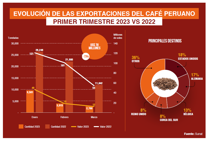Durante el primer trimestre del 2023, se exportó 16 mil toneladas de café por un valor de US$ 76 millones, mientras que en el 2022 se exportó 60 mil toneladas por US$ 275 millones. Una contracción superior al 70% tanto en volumen como en valor.