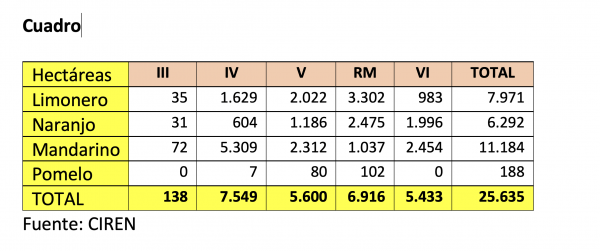 En cuanto a las especies, el mandarino lidera las plantaciones a nivel nacional, con 11.184 ha, seguido por el limonero con 7.971 ha, y por el naranjo con 6.292 ha.