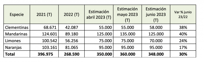 Las primeras estimaciones en abril de este año, señalaban un volumen de exportación para clementinas de 55.000 toneladas, para mandarinas de 125.000 toneladas, para naranjas 95.000 toneladas, y para limones 75.000 toneladas. En el mes de mayo, se actualizo el volumen de mandarinas a 135.000 toneladas. La última proyección, indica un volumen de clementinas de 58.000 toneladas de exportación; mientras que los envíos para las mandarinas bajarían a 125.000 toneladas, se mantendría el volumen de naranjas; y los limones también irían a la baja con 70.000 toneladas.