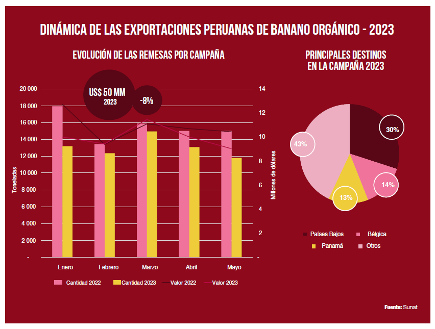 Desde inicios del 2023, las previsiones que se tenían para las exportaciones de banano orgánico peruano eran al alza. El mayor atractivo del producto en el mercado internacional pretendía mejorar la participación del fruto y llegar a competir mejor contra países sudamericanos que ya se encuentran más desarrollados en cuanto al banano orgánico, así como Ecuador (uno de los principales países exportadores de productos orgánicos hacia la Unión Europea). Sin embargo, los problemas climáticos han frenado repentinamente las remesas del producto peruano, llegando a ser uno de los productos más golpeados, teniendo en cuenta que su cultivo se da durante todo el año y está encabezado principalmente por pequeños agricultores.