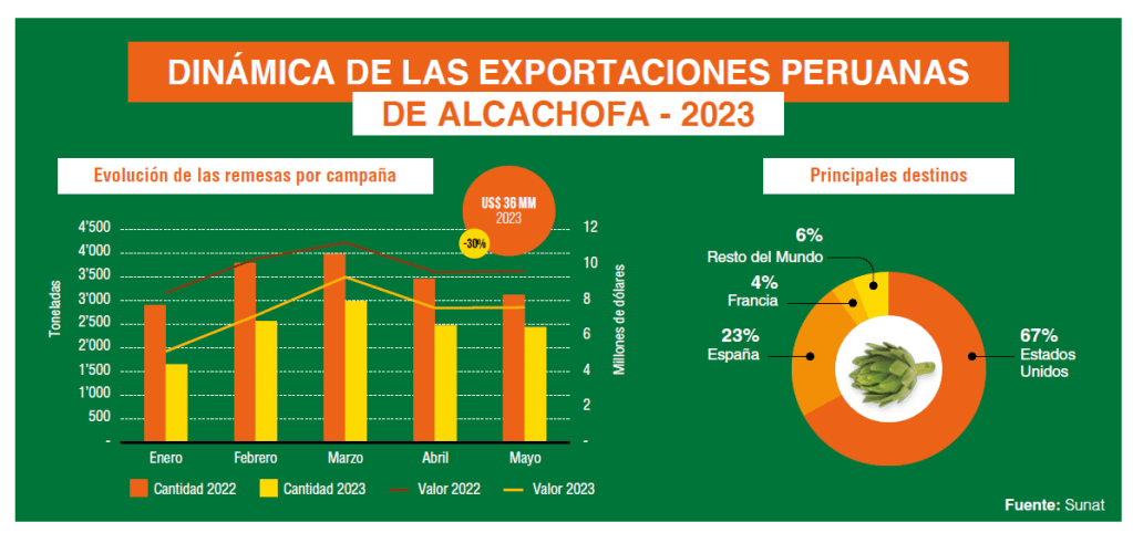 Hasta fines de mayo, las remesas de alcachofa sumaron 12 mil toneladas valorizadas en US$ 36 millones (US$ 3 por kilogramo), mientras que en el mismo periodo del 2022 se registraron 17 mil toneladas por US$ 49 millones (US$ 2.88 por kilogramo). Esto significó una caída del 30% en el volumen y de 25% en el valor. Los menores volúmenes permitieron un pequeño ajuste al alza en el precio (6%), compensando parcialmente la caída en el valor final exportado.