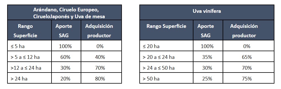 Cabe señalar que el principal cambio de esta temporada es en el sistema de reparto compartido del rubro frutícola, en donde se aumentó en un 20% la asignación del Servicio al rubro exportador (arándano, ciruelo y vid de mesa) en el rango de superficie mayor a 5 ha e igual o menor a 12 ha, quedando en 60% aporte SAG y 40% aporte productor.