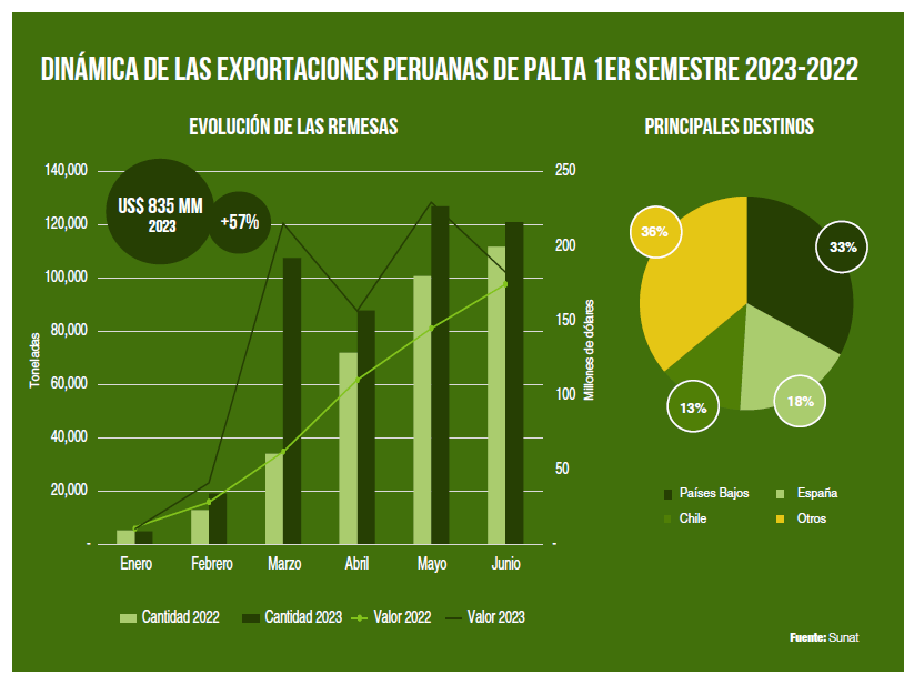 Durante los primeros seis meses del año, las remesas de palta peruana totalizaron 467,359 toneladas por US$ 835 millones, lo cual representó un aumento de 39% en el volumen y 57% en el valor exportado. El mejor precio promedio en el mercado internacional tuvo que ver con este incremento del valor, pues la palta peruana fue cotizada por US$ 1.79 por kilogramo, lo cual fue 13% mayor que el primer semestre del 2022.