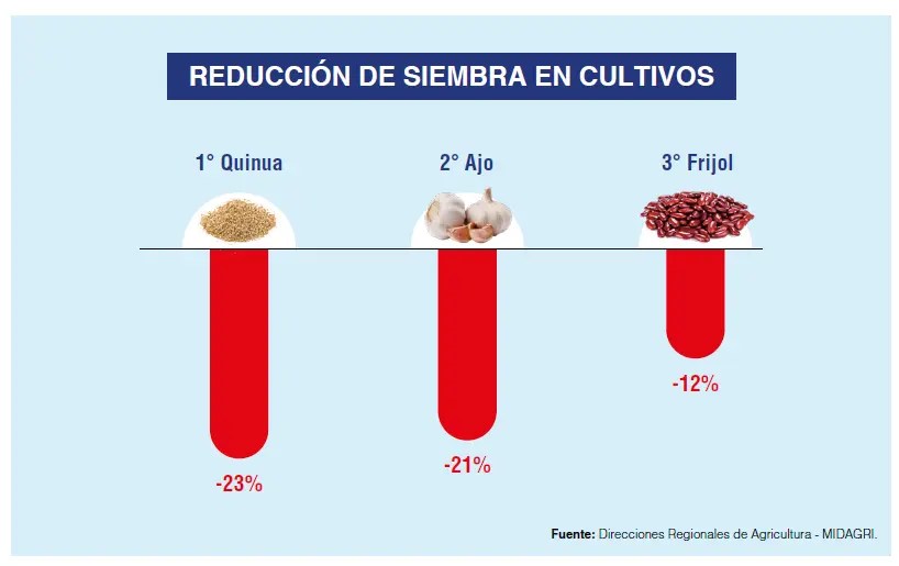 La escasez hídrica se está notando más en la sierra central y sur del país. Debido al clima de este año, los ciclos del agua fueron realmente atípicos, generando fuertes problemas en la disponibilidad del agua. A pesar de que en estas zonas del país no se concentran los mayores cultivos destinados a la agroexportación, sí existe cierto daño en productos de mediana presencia en la canasta agroexportadora peruana. Las regiones de Puno, Arequipa, Ayacucho y Junín son de las más perjudicadas. Con respecto a los productos destinados para la agroexportación, los reportes indican que los cultivos que más se han reducido son la quinua, el ajo y el frijol. La quinua ha mermado en casi 23% en comparación a lo sembrado en la campaña anterior en estas regiones. El ajo, por su lado, disminuyó su siembra en cerca del 21%. Los frijoles tuvieron una caída más ligera, con cerca del 12%.