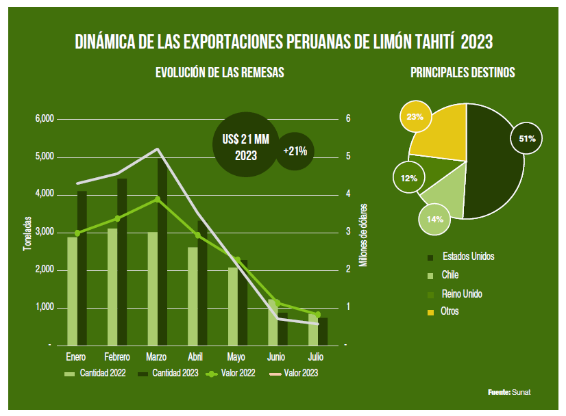 Hasta el mes de julio, el principal destino del limón Tahití peruano fue los Estados Unidos, con 9,317 toneladas enviadas por un valor de US$ 11 millones. Esto significó un crecimiento de más del 66% en volumen y 36% en el valor. El aumento acelerado afectó negativamente al precio, que estuvo en promedio en US$ 1.15 por kilogramo, 18% menos que el mismo periodo del 2022.