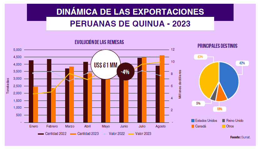 Hasta el cierre de agosto del 2023, los envíos de quinua peruana han sumado solamente 29,139 toneladas por un valor de US$ 61 millones, 11% menos en volumen y 4% menos en valor. La limitada oferta peruana produjo que el precio compense en parte la caída. El exportador peruano recibió en promedio US$ 2.09 por kilogramo de quinua, 8% más que el año pasado y, con este resultado, la mala racha para la quinua peruana parece continuar un año más. Pero ello no solo le ocurre al Perú: Bolivia está sufriendo los mismos problemas, tanto a nivel interno como externo, generando una gran crisis para este grano.