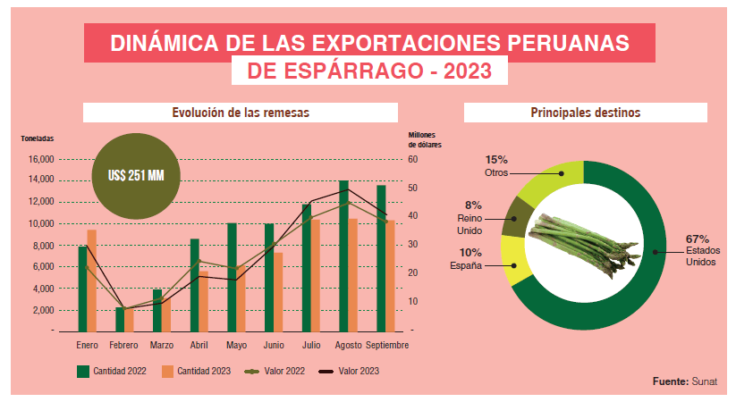 Hasta el mes de septiembre, los envíos de espárrago peruano totalizan 65,176 toneladas por un valor de US$ 251 millones. Esto significó una caída en los volúmenes del 21%, pero con un crecimiento del valor del 4%, resultado bastante impresionante considerando lo limitados que fueron los envíos.