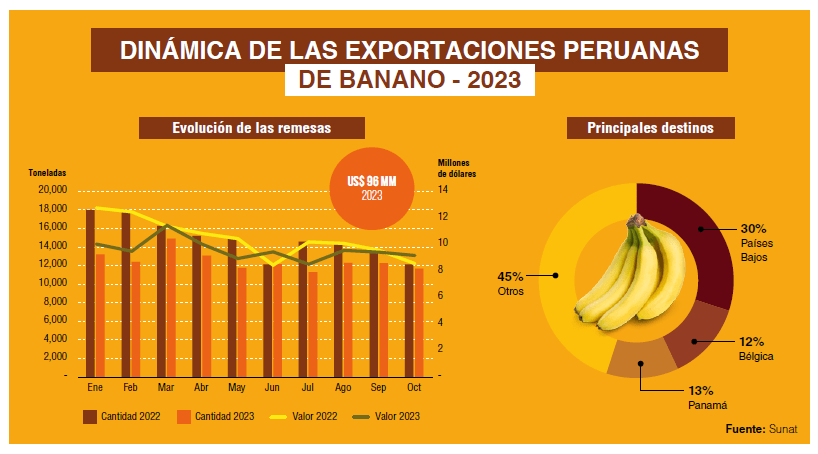 Según Fresh Fruit Perú, hasta octubre de este año, los envíos de banano fresco han sumado 125,090 toneladas por un valor de US$ 96 millones. Esto significó una caída del 16% en el volumen y 8% en el valor.