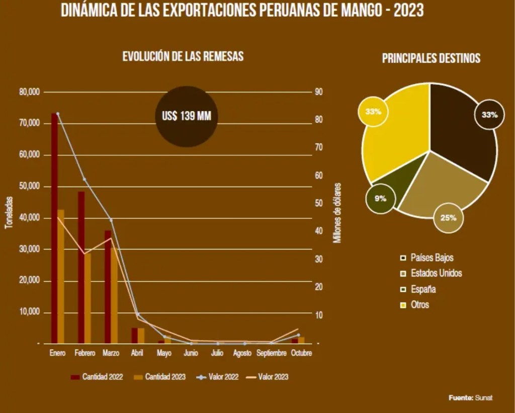 Hasta octubre de este año, los envíos de mango fresco peruano totalizaron 113,822 toneladas por un valor de US$ 139 millones. Esto significó una caída en volumen de 31% y una reducción en valor de 31%, de las mayores bajas de los últimos años. En cuanto al precio, este se cotizó en US$ 1.22 por kilogramo, similar al precio del año anterior.