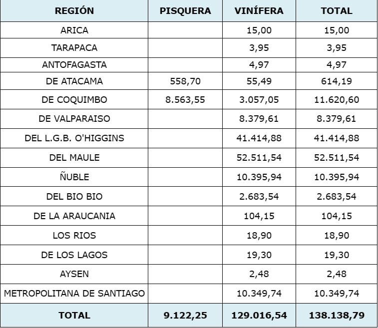El Catastro Vitícola 2022 presenta una superficie de plantaciones de variedades de vides pisqueras y viníferas de 138.138,79 hectáreas en total, de las cuales las plantaciones de vides para vinificación alcanzan una superficie de 129.016,54 ha y vides pisqueras 9.122,25 ha.