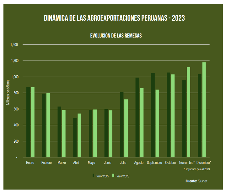 Durante el primer trimestre del 2023, la situación imperante se presentó en los conflictos sociales que limitaron el transporte y procesamiento de los productos agrícolas. Además, las precipitaciones que azotaron la costa norte encontraron su pico en estos meses. A pesar de ello, los remesas no presentaron una gran caída ya que las consecuencias de estas desfavorables situaciones se iban a sentir más adelante. Con ello, las remesas totalizaron cerca de US$ 2,255 millones, 2% menor al año anterior.