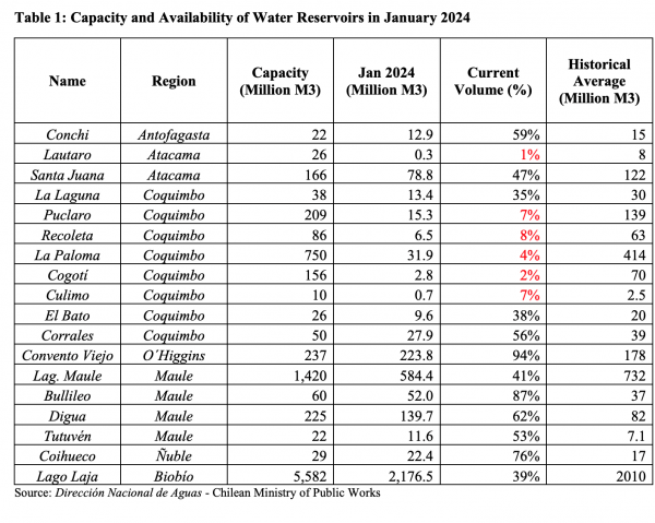 De acuerdo con USDA la sequía sigue siendo grave en el norte; como en las regiones de Atacama y Coquimbo, la cual registró menos precipitaciones de lo normal en 2023. Además, hasta enero de 2024, la mayoría de los grandes embalses de agua del norte del país acumularon menos agua que su promedio histórico y mantienen volúmenes inferiores al 10% de su capacidad.