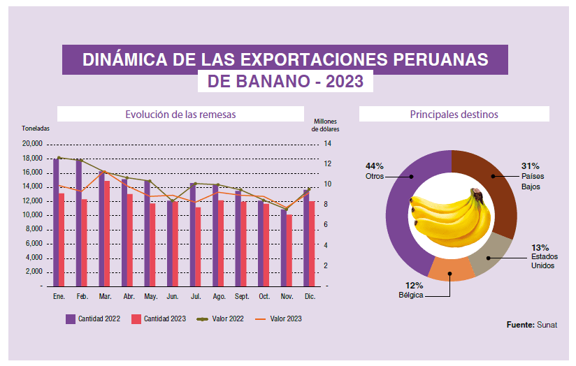 Asia también se presentó como una región importante para el banano peruano. Corea del Sur se mantuvo como el mayor destino de este continente. Las exportaciones hacia este país también retrocedieron debido al limitado stock peruano, con una caída del 9% en el volumen. Sin embargo, el precio pudo compensar esta caída con un crecimiento de 11%. En Japón, la situación se mantuvo muy parecida al año anterior, con envíos prácticamente similares al del 2022, pero con un aumento del 8% en el precio promedio recibido.