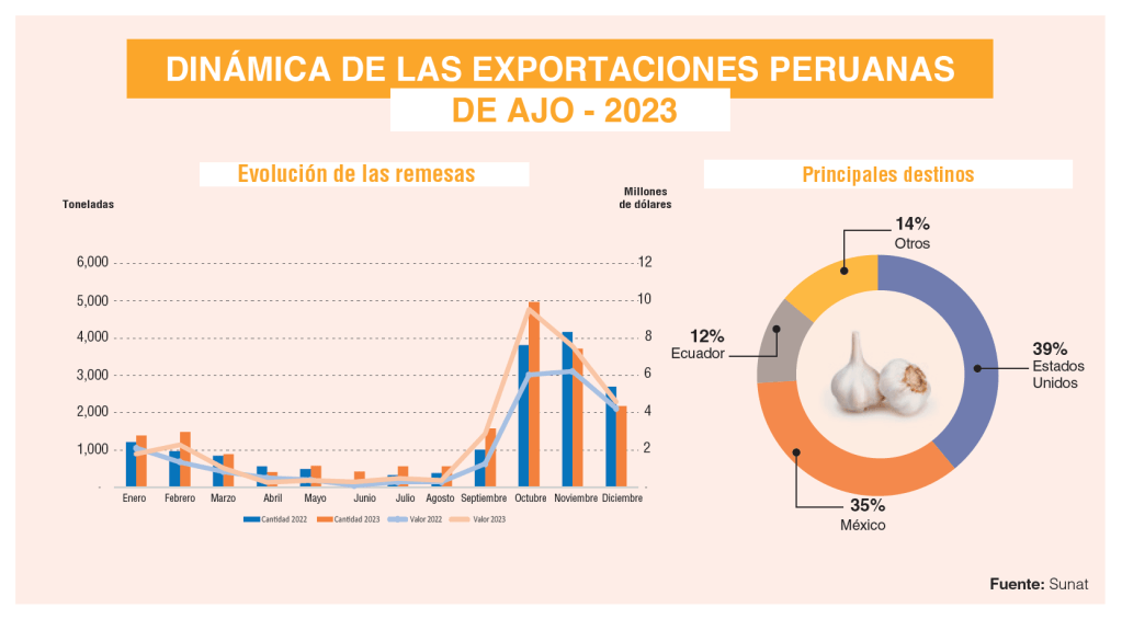 Los Estados Unidos fue el principal destino del ajo fresco peruano. Debido a que la calidad y la cantidad de ajo con origen chino decayó gravemente, se generaron espacios importantes durante gran parte del año. La expectativa a inicios del año pasado era que la producción de países europeos —como España— pudiera cubrir las necesidades del mercado que iba a generar la falta de ajo chino, especialmente en lo asociado a calidad. Sin embargo, una marcada sequía en regiones productoras de España limitó enormemente la cantidad de ajo que podía enviar. Además, existiendo una demanda europea por satisfacer, este posible reemplazo no pudo darse en su totalidad. Esto generó que el Perú pudiera enviar hasta 127% más volumen de ajo a los Estados Unidos. Y aun siendo volúmenes bastante elevados, el preció también subió mas de 11% (US$ 2.44 por kilogramo).