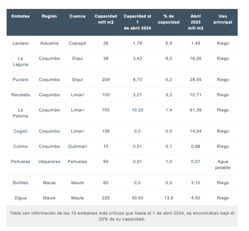 Destaca también que el volumen almacenado actual supera el promedio histórico mensual de 5.151 millones de m3. Sin embargo, se identifican 10 embalses con un volumen actual inferior al 20% de su capacidad, especialmente en la Región de Coquimbo.