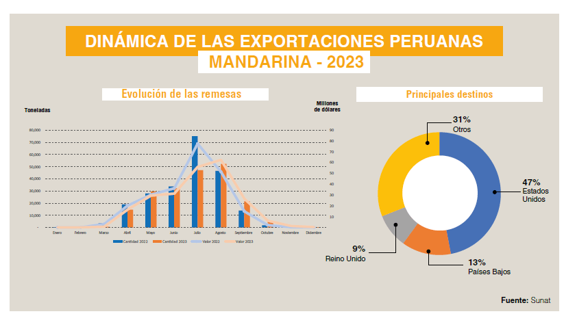 En el 2023, las variedades tempranas no se vieron tan afectadas a inicios del año. Sin embargo, las fuertes precipitaciones entorpecieron los procesos logísticos en su distribución. Incluso la oferta global no sentía gran escasez en la primera mitad del año, por lo que no hubo grandes aumentos en el precio recibido por estas mandarinas. Con respecto a las variedades tardías, estas sí vieron afectadas sus procesos de desarrollo, por lo que la producción se redujo, al igual que la del resto del mundo. La Murcott —principal especie exportada por el Perú— redujo sus volúmenes hasta en un 21%. Sin embargo, la escasez se empezó a sentir cada vez más en el mundo, por lo que el precio subió en casi un 14%. También variedades más premium como la Malvasio, Nadorcott y Tango ganaron terreno debido a la demanda insatisfecha mundial. Sin embargo, estas no pudieron escalar mucho en volúmenes debido al difícil momento climático que atravesó el país.